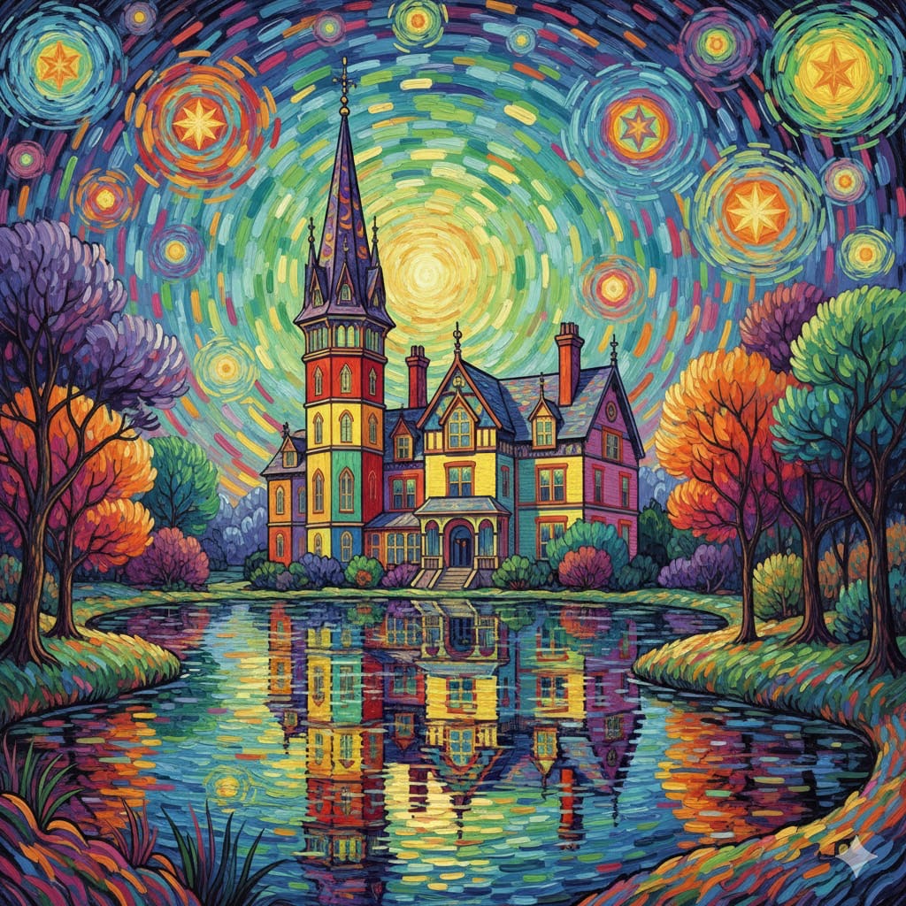 Milner Field also had a charming boating lake in the grounds. Again this is a representation of the lake and house in cheerful mode.